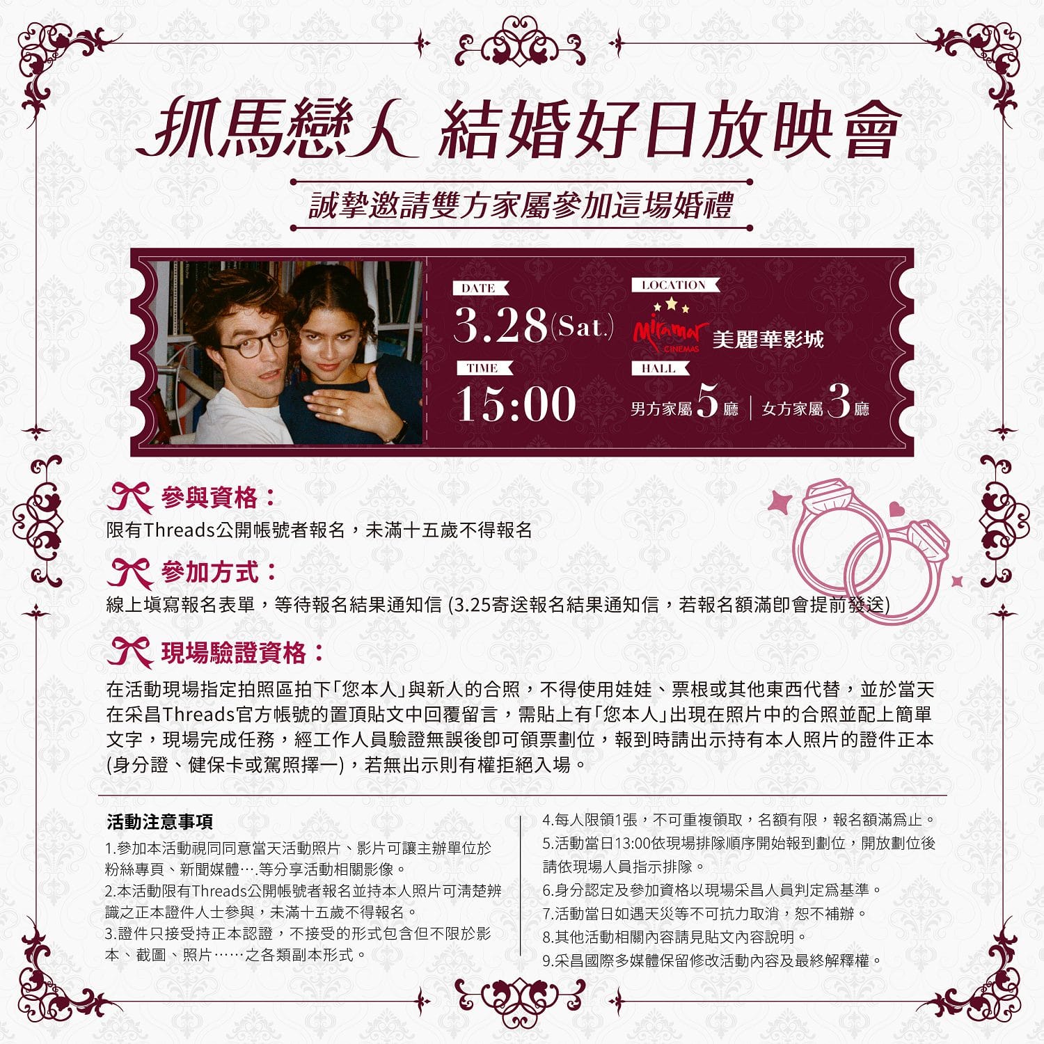 宣傳的活動設計也強化了這種印象。像是 A24 主打「拉斯維加斯限定婚禮教堂」、「Zendaya 驚喜證婚」、采昌還辦了「結婚好日放映會」,邀請觀眾「成為主角雙方家屬,一同共襄盛舉這個大囍之日」。這種宣傳很聰明,也很有效,但它會把觀眾往「婚禮愛情片」的方向誤導。等到真正進場,才發現這根本不是一部輕鬆的浪漫喜劇,而是一部充滿惡意、不安與倫理挑戰的黑色幽默電影,自然就很容易產生巨大的落差感。